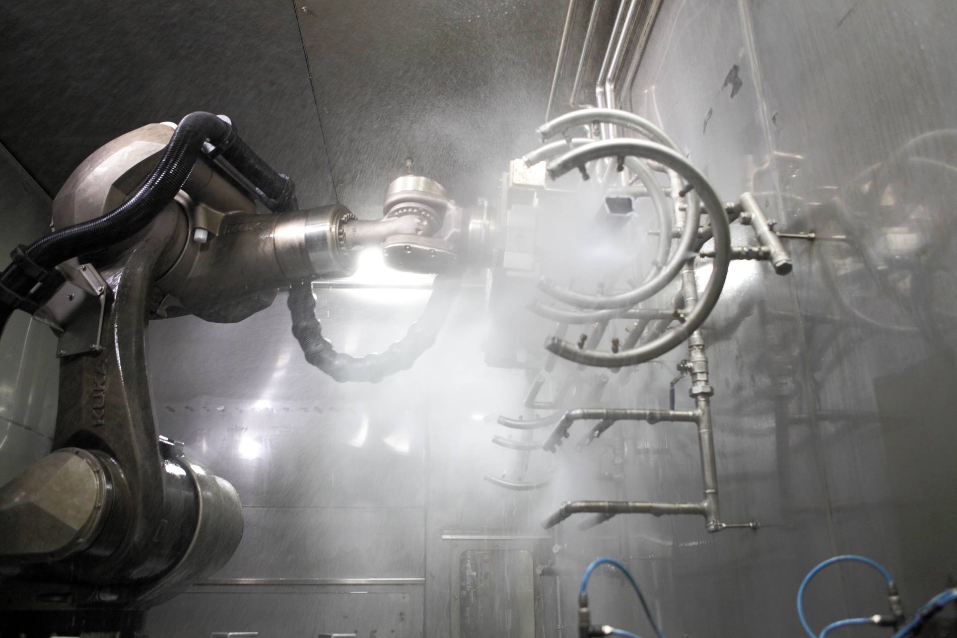 A KUKA washing robot cleans components in a washing cell.