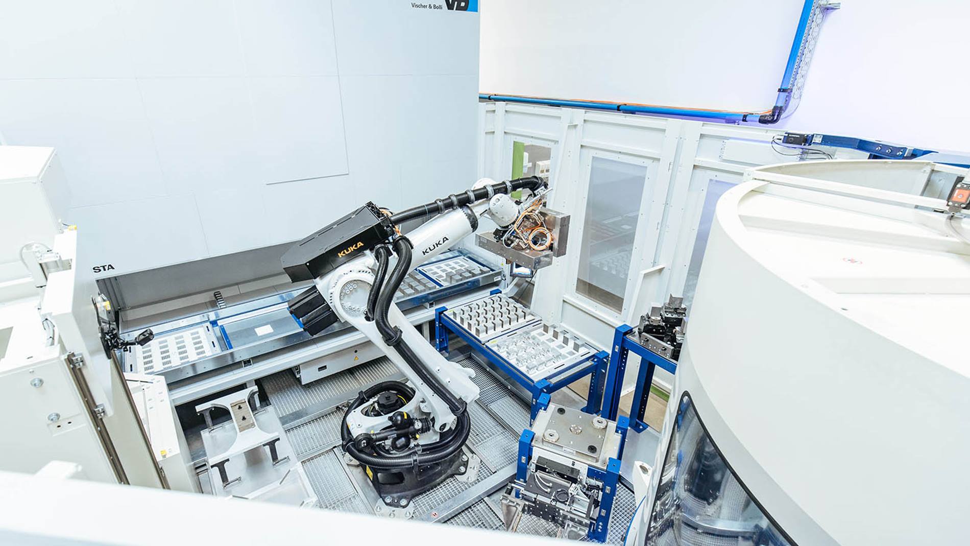 Na célula, robôs KUKA são responsáveis pelo carregamento da fresadora e o pós-processamento automatizado das peças.