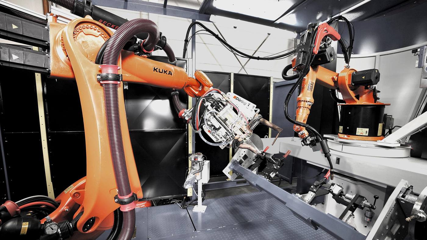 首先工作人員將工件放到焊接裝置中,然后啟動機(jī)器。工作臺將夾緊完畢的裝置在機(jī)器人下方的焊接區(qū)域中 旋轉(zhuǎn) 180 °。庫卡 KR 6-2 配備了用于氣體保護(hù)焊的 Fronius CMT 焊槍,進(jìn)入裝置并且對工件進(jìn)行焊接。然 后,第二臺 KR 210 R2700 extra 型機(jī)器人裝配了 Düring 焊接技術(shù)公司的伺服氣動機(jī)器人鉗 X 100,重新進(jìn) 入裝置并且通過點焊的方式連接工件。在焊接過程結(jié)束之后,H 型工作臺會旋轉(zhuǎn),將第二個新裝好工件的 裝置移入機(jī)器人的工作區(qū)域中。第一個裝置通過旋轉(zhuǎn)重新進(jìn)入人員所在的區(qū)域。夾具以氣動方式打開并且 使人員可以取出完成焊接的工件。人員負(fù)責(zé)取出和裝上新工件,完全配合生產(chǎn)流程節(jié)奏。